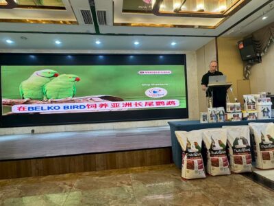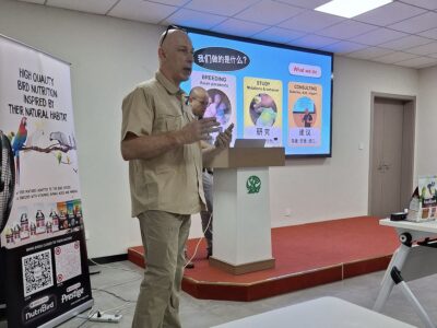 After lunch we gave a lecture about bird breeding and management. The lecture was given in English and was fully translated into Chinese. There was a lot of interest in this lecture. The group of more than 120 participants consisted mainly of local breeders, but there were also breeders who had traveled for hours to attend. After the lecture, there were many questions about hand-rearing and the correct preparation method for NutriBird. All attendees also received a certificate of participation and a goodie bag containing, among other things, a Loro Parque seed mix from Versele-Laga.