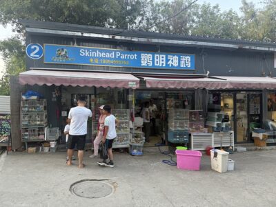 중국에서는 사육할 수 있는 조류 종의 수는 제한되어 있으나 시,군 또는 도에 따라 다르다고 합니다. 가장 일반적인 조류 종은 코뉴어, 왕관앵무, 퀘이커(몽크 앵무새) 입니다. 우리 일행은 퀘이커와 코뉴어를 전문으로 하는 몇몇의 사육장을 방문했습니다. 운 좋게도 아프리칸 회색 앵무, 그린-윙드 마카우, 청금강 마카우, 그리고 소수의 인디안 링넥 단순변이종도 볼 수 있었습니다.