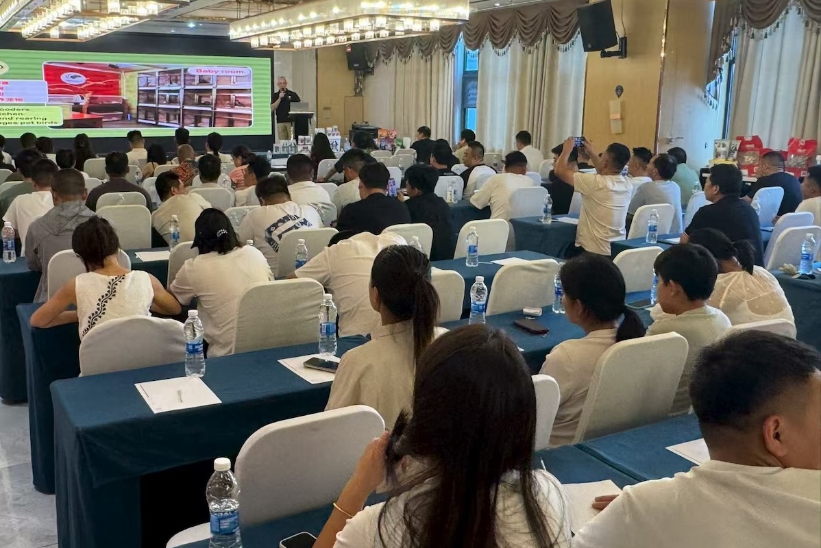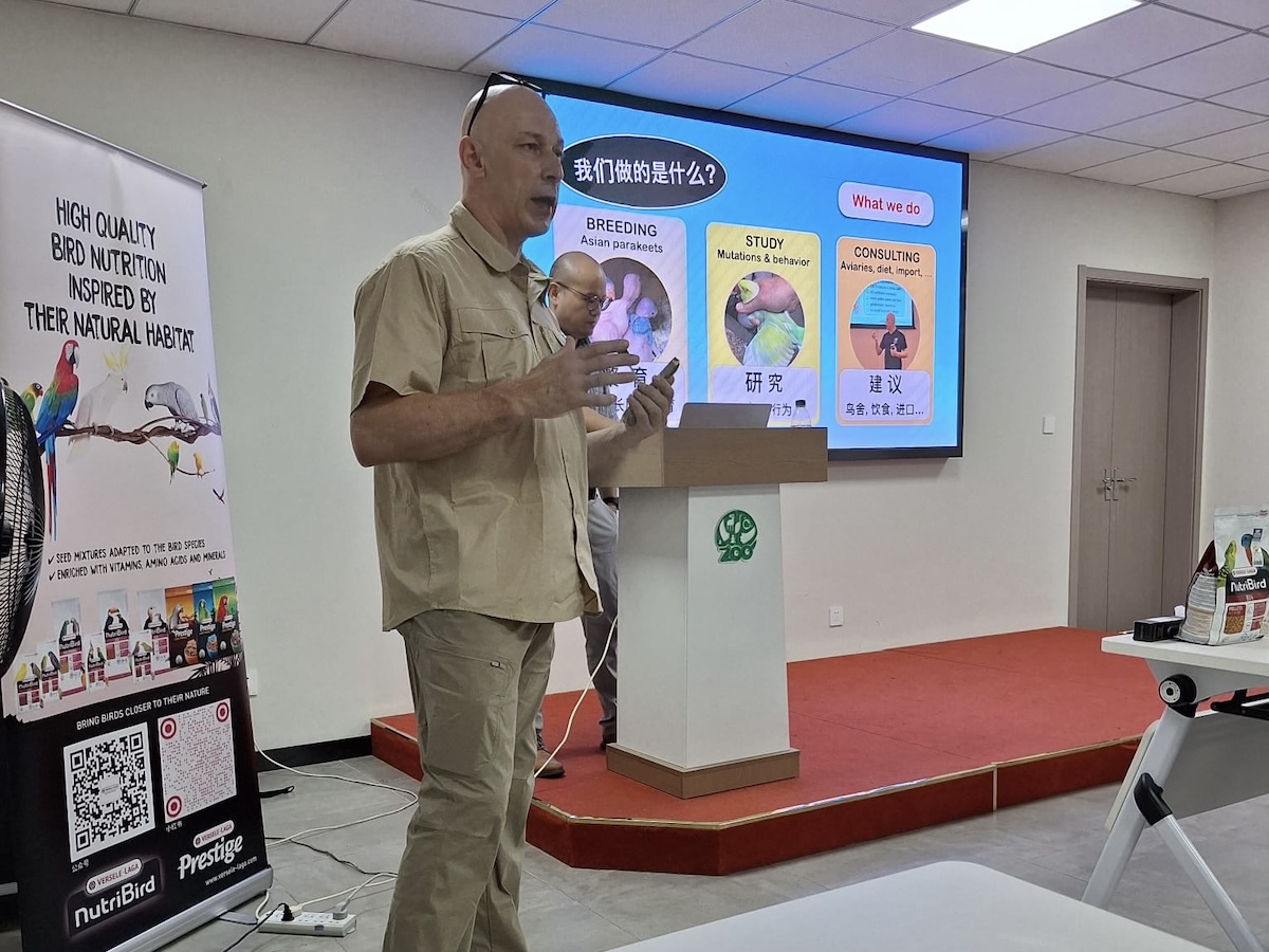 점심 이후에, 조류 번식 및 관리에 대한 강의를 진행 하였습니다. 강의는 영어로 진행되었으나 중국어로도 강의 내용 전체를 번역하였습니다. 강의에 대한 참석자들의 관심은 매우 높았습니다. 120명 이상의 참석자로 구성된 그룹은 주로 현지 사육사들로 이루어져 있었지만, 강의에 참석하기 위해 몇 시간 동안을 여행한 사육자들도 있었습니다. 강의 후에는 인공 사육과 누트리버드(NutriBird)의 올바른 준비 방법에 대한 많은 질문들이 이어졌습니다. 모든 참석자들에게 버셀레-라가의 로로 파크(Loro Parque) 혼합알곡을 포함한 선물 가방과 참석 인증서가 증정되었습니다.
