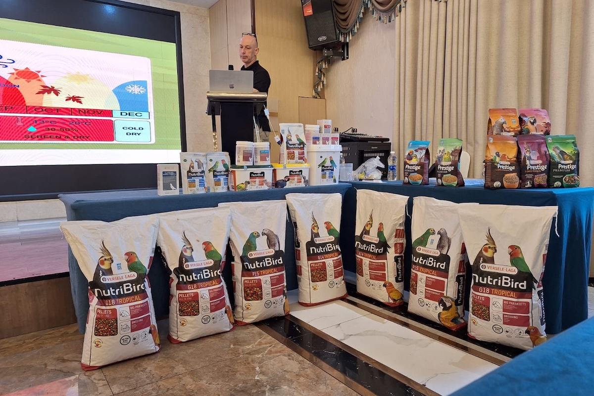 After lunch we gave a lecture about bird breeding and management. The lecture was given in English and was fully translated into Chinese. There was a lot of interest in this lecture. The group of more than 120 participants consisted mainly of local breeders, but there were also breeders who had traveled for hours to attend. After the lecture, there were many questions about hand-rearing and the correct preparation method for NutriBird. All attendees also received a certificate of participation and a goodie bag containing, among other things, a Loro Parque seed mix from Versele-Laga.